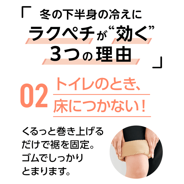 - アウターのデザイン、素材により、裾をまくり上げても留まりづらい場合があります。その場合は、アウターとラクペチを共に、裾を数回折り返してください。