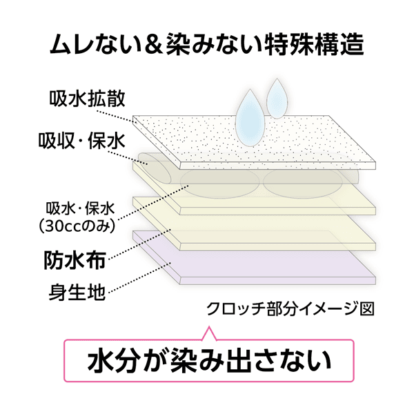 - クロッチ部は多層構造で水分をすばやく吸収しムレにくく快適