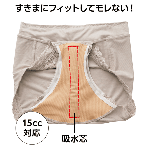 お客様アンケートのお声から誕生した吸水ショーツ。普通のショーツのように毎日はきやすく、身体のすきまにフィットする立体構造です。吸水後、ニオイもカット。頼もしい15cc対応なので、ちょっと不安なお出かけや旅行も快適に楽しめます。深めのウエスト部分は幅広いマチでくい込みにくく、安心感のあるはき心地です。
