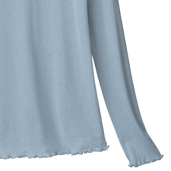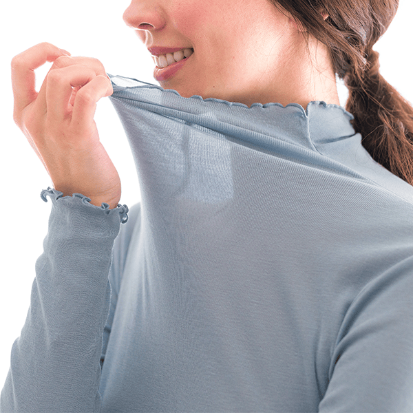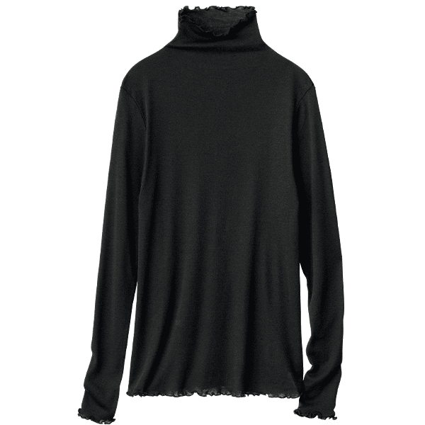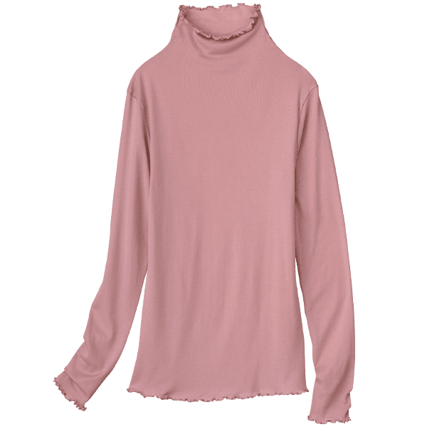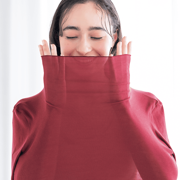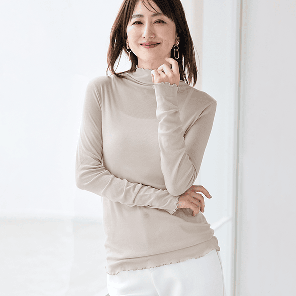 - 着た瞬間「気持ちいい!」となるような肌ざわりです。ポリウレタン入りの肌着によくあるような”ぴったり身体にフィットする”というよりは、”やさしく身体に寄り添う”という感じです。端がフリフリとしたハイネック仕様なので気になる首元を自然にカバーしながら顔まわりに華やかさをプラスしてくれます。シアー感のある軽い素材なので、寒暖差が気になる時季のお役立ちインナーとしても、またキャミソール等と合わせてアウターからあえて見せて着てもオシャレだなと思いました。