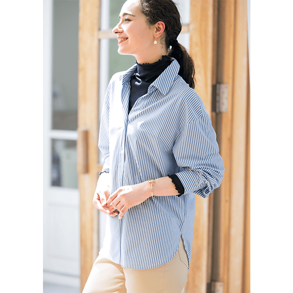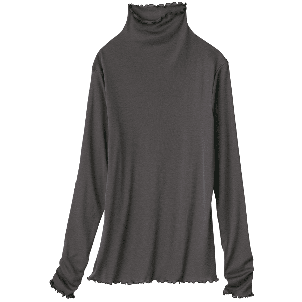 - 着用したときから、生地の柔らかさと伸び感の良さからとても着心地が良いと感じました。からだにふわっと優しく触れているような着用感です。普段は高さのあるハイネックなどは、首回りの当たりが気になったり動いたりしたときにやや苦しく感じるのであまり好きではないのですが、こちらは高さのあるハイネックでも着用感が良い為、嫌な感じが全くありませんでした。ほどよい透け感があってレイヤードなどにもちょうど良さそうです。