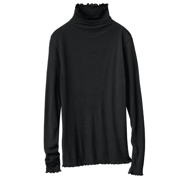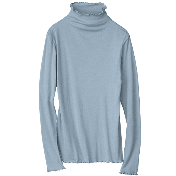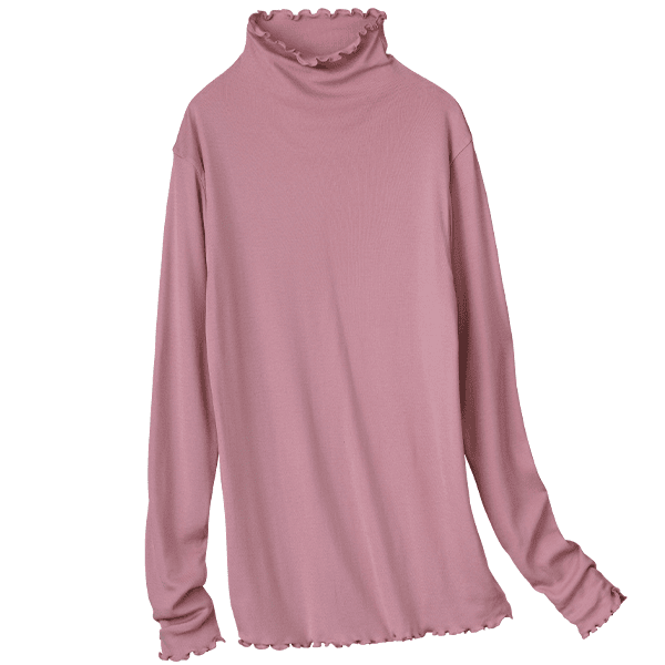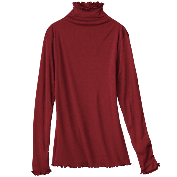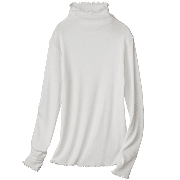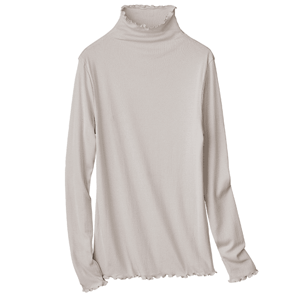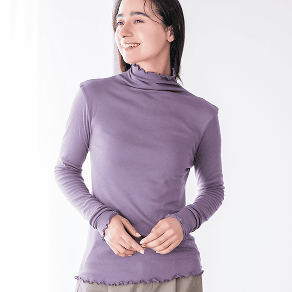 - 着た瞬間「気持ちいい!」となるような肌ざわりです。ポリウレタン入りの肌着によくあるような”ぴったり身体にフィットする”というよりは、”やさしく身体に寄り添う”という感じです。端がフリフリとしたハイネック仕様なので気になる首元を自然にカバーしながら顔まわりに華やかさをプラスしてくれます。こちらは生地が2枚仕立てになっているので、透け感は気になりません。寒暖差が気になる時季のお役立ちインナーとしても、またアウターからあえて見せて着てもオシャレだなと思いました。