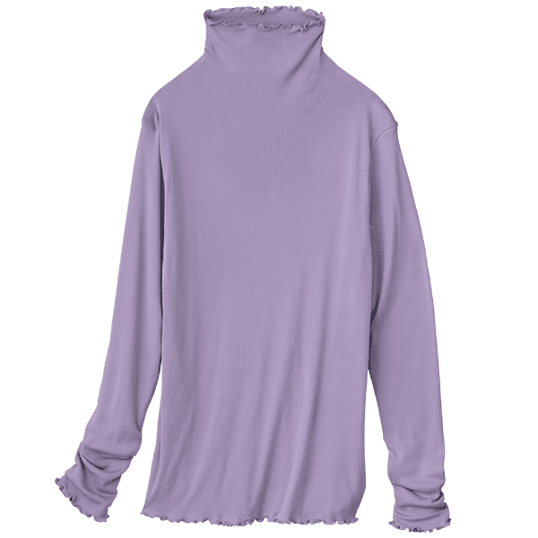 - 綿レーヨン素材が肌に優しく、もっちりふわっとした着心地で、着用していて快適です。ピッタリしすぎない生地感なので、ストレス無く使用できますし、2枚仕立てになっているので、着用感に対し生地がしっかりして見えるので、アウターとしても使用できると思います。ハイネックと長袖で首元や腕をカバーしてくれて暖かいですし、端のメロー始末が思った以上にしっかり出てかわいい雰囲気になります。重ね着をしてチラっと見せたりしておしゃれに使えそうです。