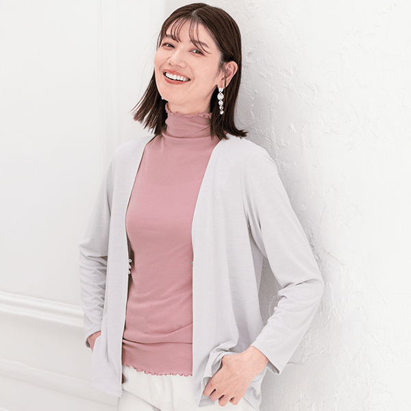 - 着用したときから、生地の柔らかさと伸び感の良さからとても着心地が良いと感じました。からだにふわっと優しく触れているような着用感です。普段は高さのあるハイネックなどは、首回りの当たりが気になったり動いたりしたときにやや苦しく感じるのであまり好きではないのですが、こちらは高さのあるハイネックでも着用感が良い為、嫌な感じが全くありませんでした。ほどよい透け感があって、首回りもさりげなくカバー出来ます。