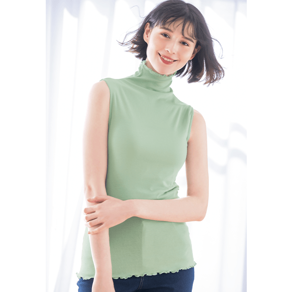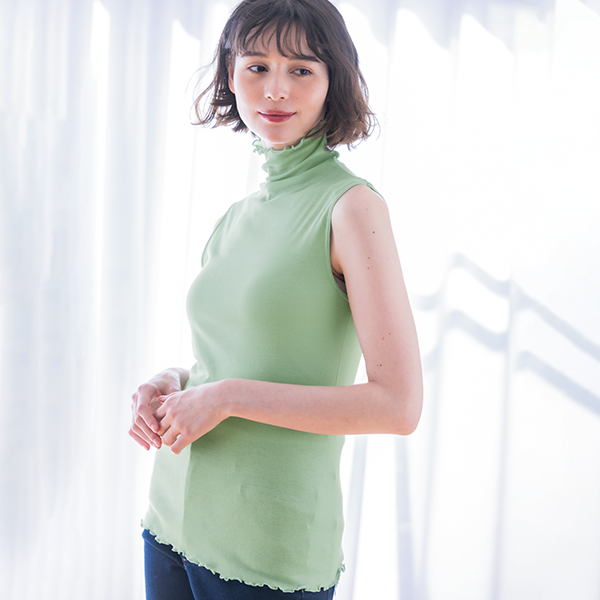 - 着た瞬間「気持ちいい!」となるような肌ざわりです。ポリウレタン入りの肌着によくあるような”ぴったり身体にフィットする”というよりは、”やさしく身体に寄り添う”という感じです。端がフリフリとしたハイネック仕様なので気になる首元を自然にカバーしながら顔まわりに華やかさをプラスしてくれます。シアー感のある軽い素材なので、寒暖差が気になる時季のお役立ちインナーとしても、またキャミソール等と合わせてアウターからあえて見せて着てもオシャレだなと思いました。袖がないタイプなので暑さが本格的になる季節まで長く使えそうです!