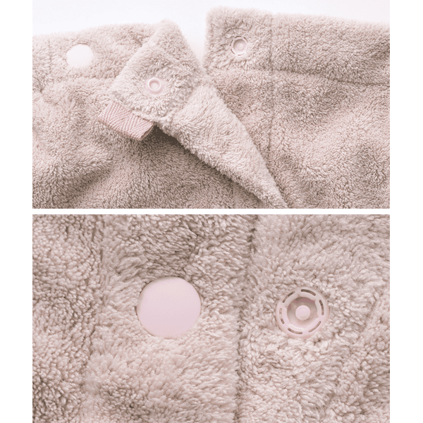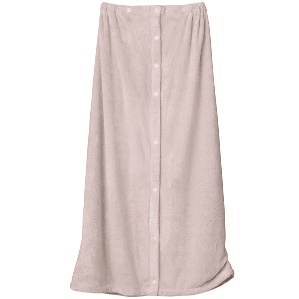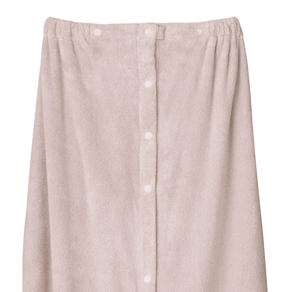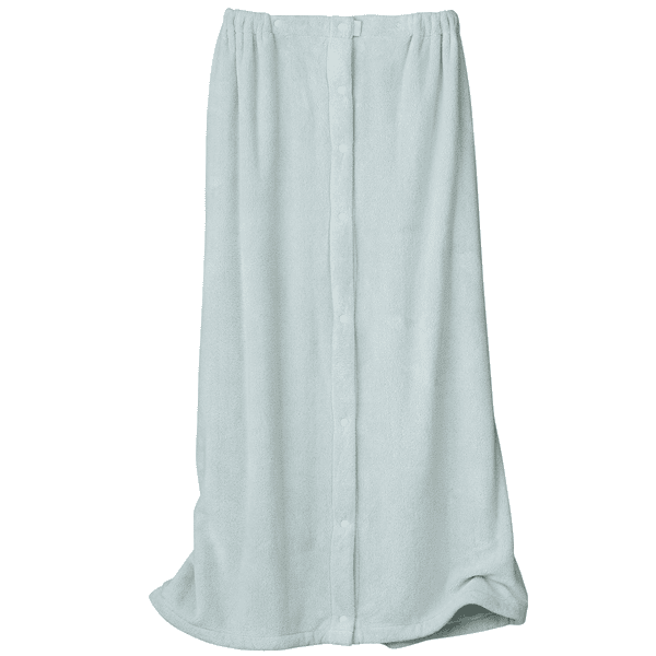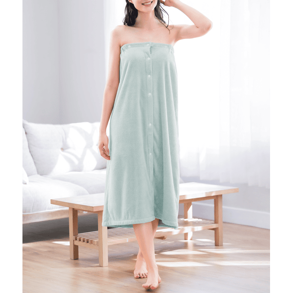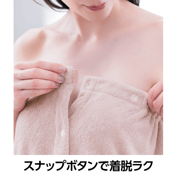 くるっと巻いてボタンを留めるだけの簡単ラップ式バスタオル。吸水性が高く、ループが空気の層を作るので保温性もある肌あたりのよいしなやかなパイル地。さっと着やすいゴム入りギャザーとスナップボタン付きで、大人も使いやすいロング丈仕様。肩から羽織ったり、ウエストで着用することも可能です。