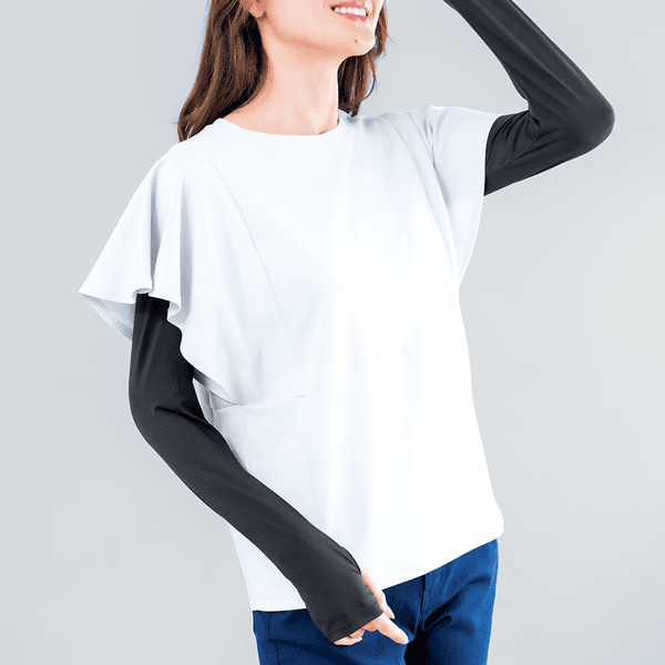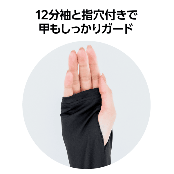 屋外作業をする人たちが愛用する遮熱インナーを女性用にアレンジしました!手の甲まである12分袖でうっかり焼けも防止します。