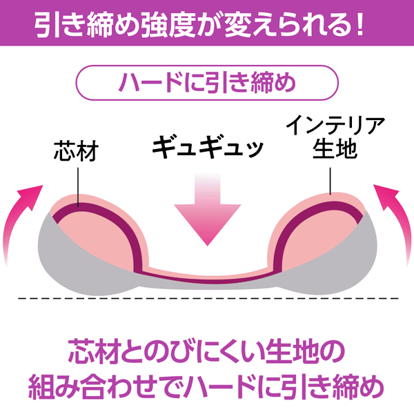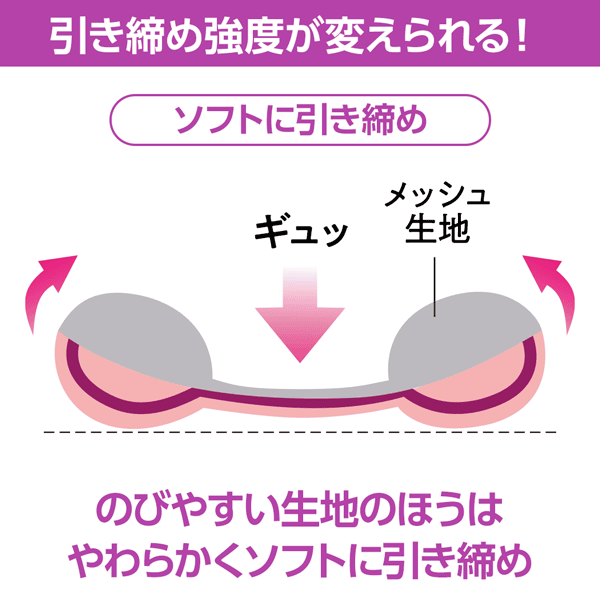 のびにくい生地側に座ることで、サイドのふくらみがより大きく持ち上がり強めの引き締め感で使用できます。