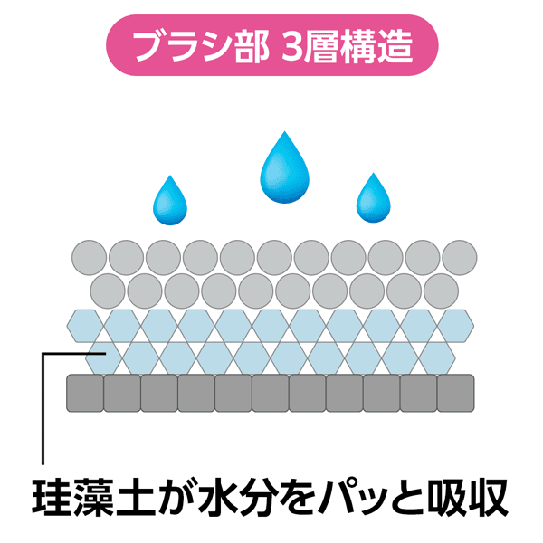 珪藻土が水分をすばやく吸収し拡散するので、毎日のドライヤー時間の短縮ができるヘアブラシ。