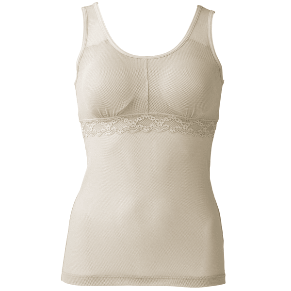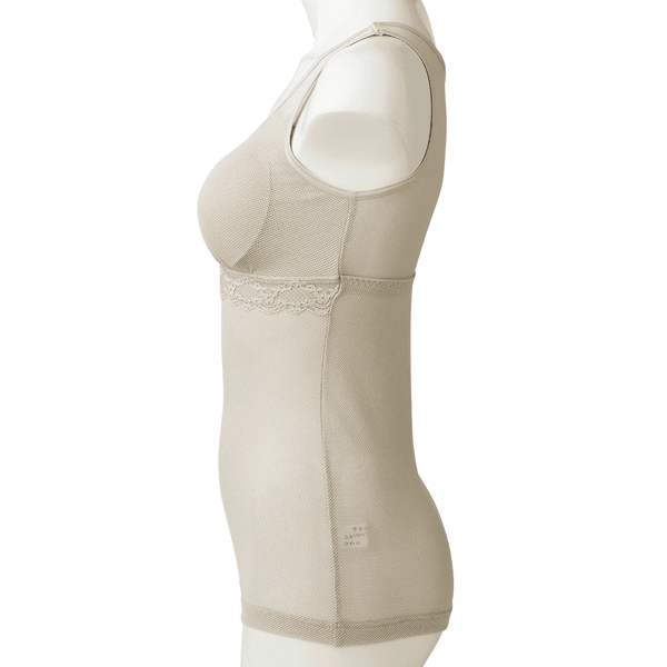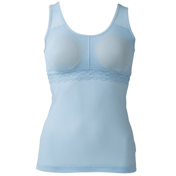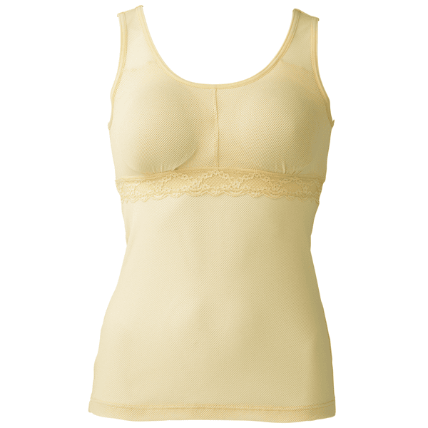 風を通すやわらかなメッシュ素材を全面に使って仕上げた、夏にぴったりのインナーです。背中も谷間も汗をためずサラッと快適。高い温度と湿度に悩まされる夏の不快感を軽減し、長い夏を心地よく過ごせます。前ゴムなし、後ろはゴム仕様で安定感のある着け心地のカップイン・タンク。