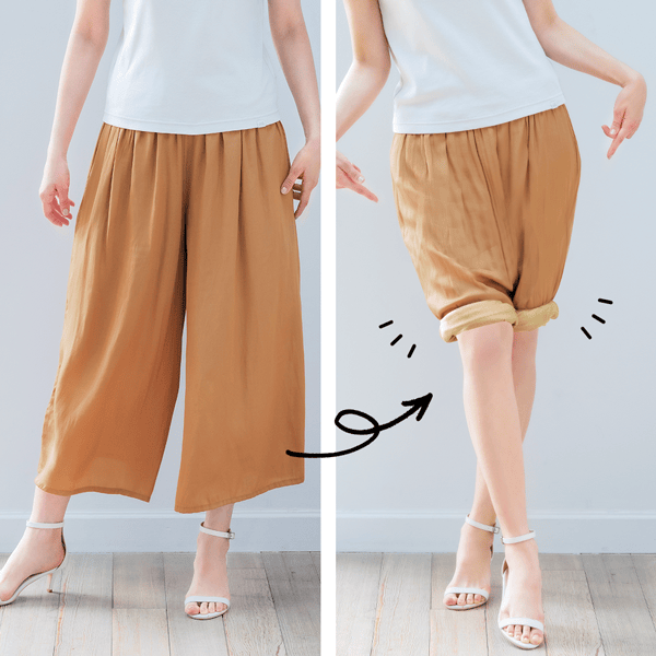 - アウターのデザイン、素材により、裾をまくり上げても留まりづらい場合があります。その場合は、アウターとラクペチを共に、裾を数回折り返してください。
