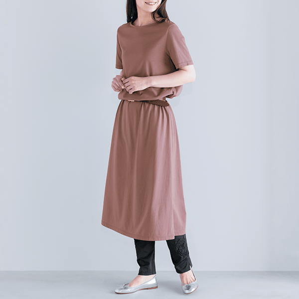 脚のラインをひろいにくい、ゆるやかシルエット。ヒップやお腹まわりもゆったり設計です。ウエストはゴム包み仕様で肌あたりやさしい。