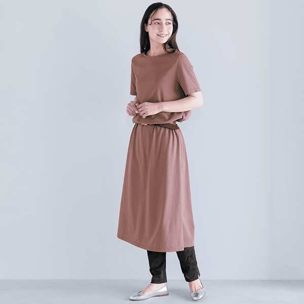脚のラインをひろいにくい、ゆるやかシルエット。ヒップやお腹まわりもゆったり設計です。ウエストはゴム包み仕様で肌あたりやさしい。
