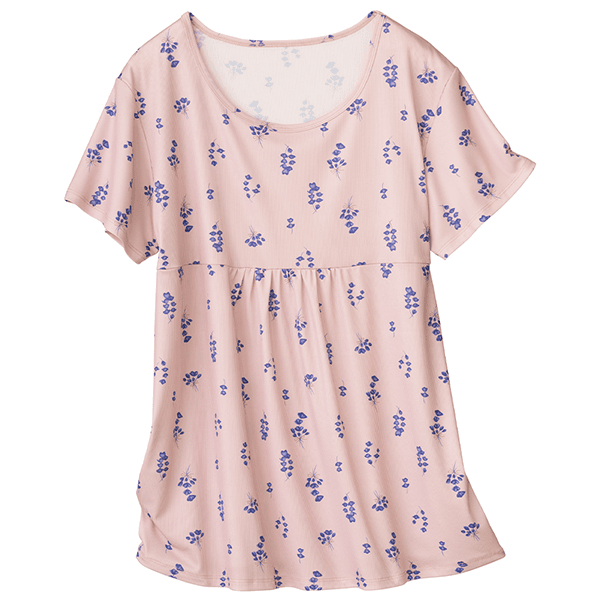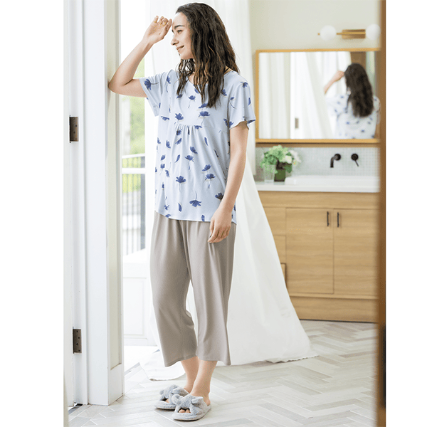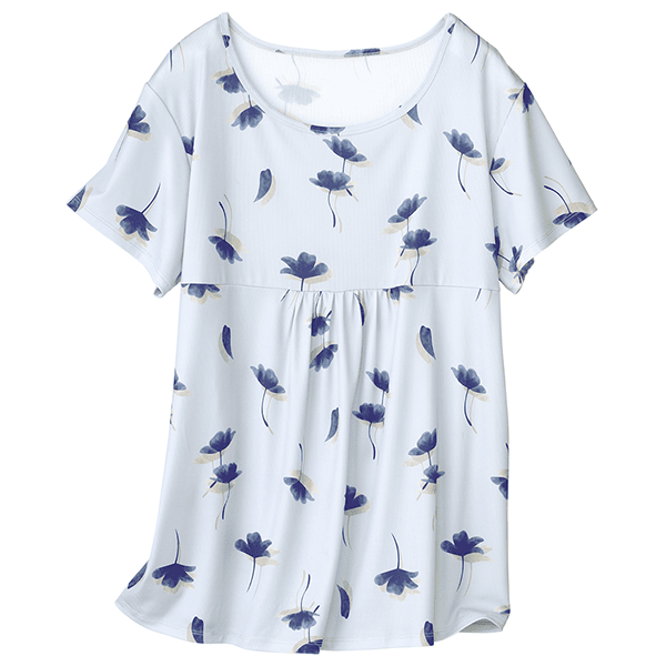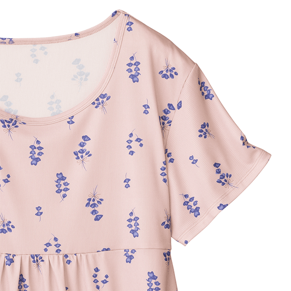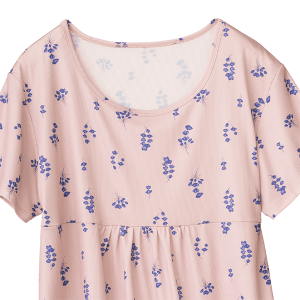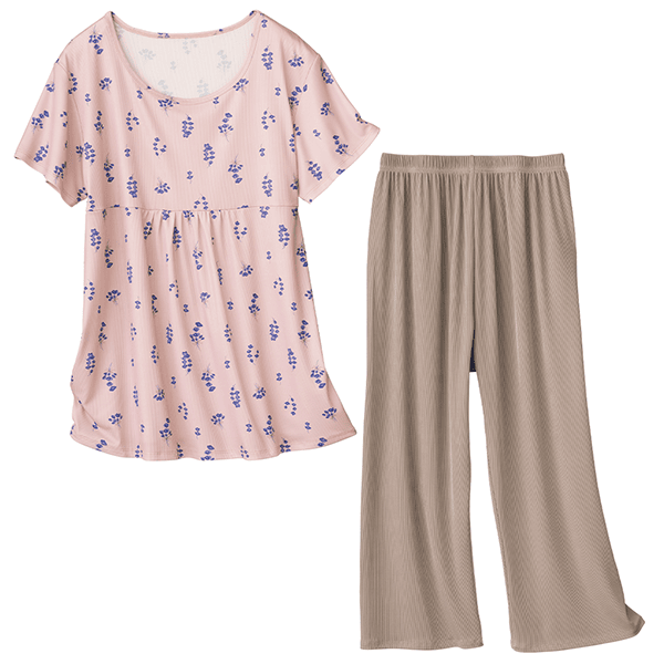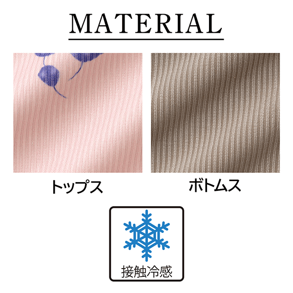 ひんやりとろみ感が気持ちいいなめらか素材の花柄トップス×無地ボトムスのルームウェア上下セット。凹凸のあるリブ素材なので汗をかいても肌にはり付きにくく、バスト下切替えギャザーで体型を自然にカバーしてくれます。接触冷感で朝まで気持ちいい、ぐっすり快眠ウェア。