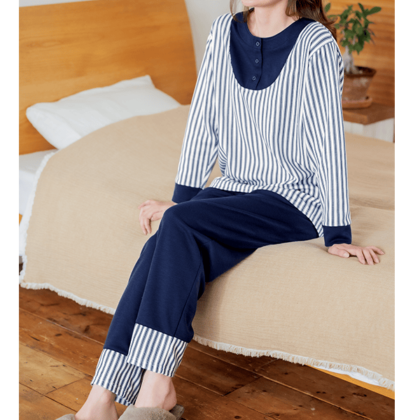 快眠設計でよい眠りに導く、毎日着たくなるあたたかい肌ざわりのパジャマ。突っ張りを感じにくく、寝返りがしやすいゆとりのあるシルエットも魅力。ふっくらした生地は保温性・保湿性もあり、秋冬にぴったりです。肌ざわりがよく、適度なぬくもりがありムレない素材だと、お休み前からリラックスできますよ。