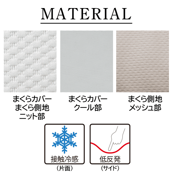 - 素材/まくらカバーニット部:ポリエステル70% レーヨン30% まくらカバークール部:ナイロン90% ポリウレタン10% まくら側地ニット部:ポリエステル70% レーヨン30% まくら側地メッシュ部:ポリエステル100% まくら中材:ポリウレタン樹脂 ポリエステル ポリエチレン樹脂