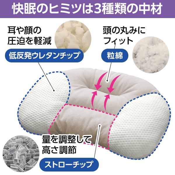 - 3種類の中材(粒綿・低反発ウレタンチップ・ストローチップ)を内蔵