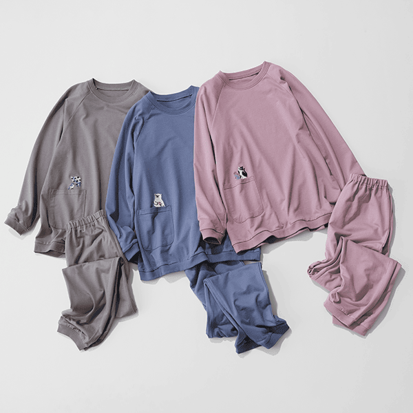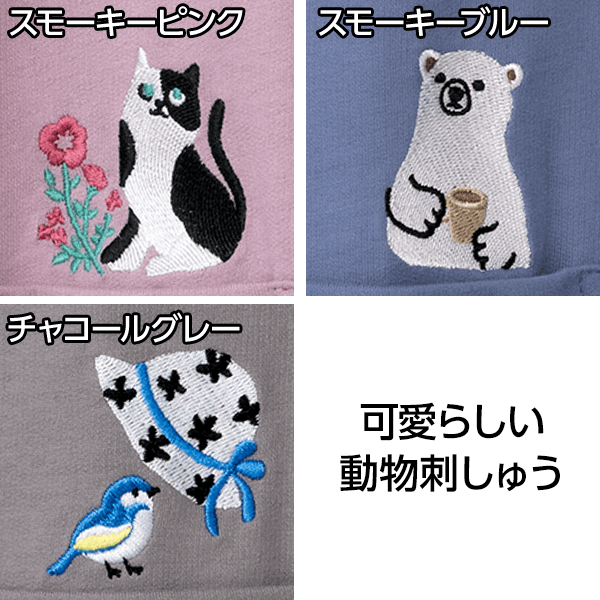- ワンポイント刺しゅう柄は、スモーキーブルーはシロクマ、チャコールグレーは鳥、スモーキーピンクはネコです。
