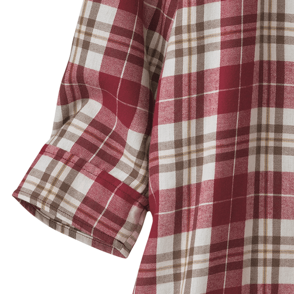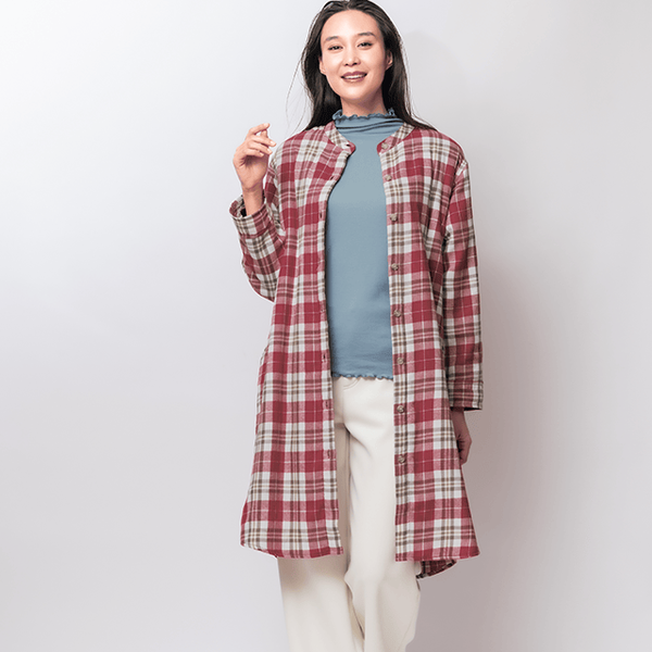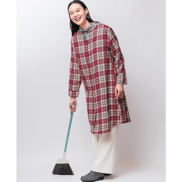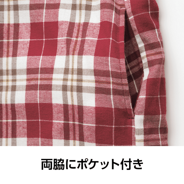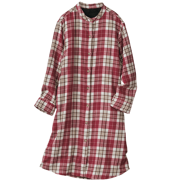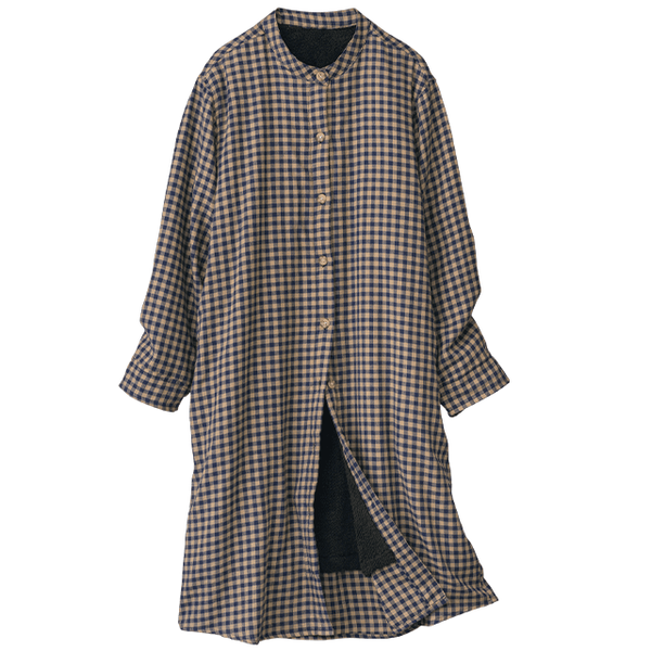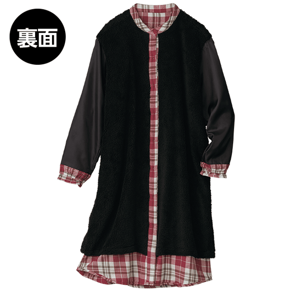 - カジュアルなチェック柄のシャツワンピのように着用できますが、ロング丈の裏ボアが思っていた以上に暖かく、部屋着になりすぎなくてとてもいいと思いました。袖部分はボア無しですが、袖口がゴム仕様で腕まくりしやすく、軽快に動けておうちで活躍してくれそうです。身長150cmでMサイズを着用したところ、ひざがすっぽり隠れてふくらはぎに届くくらいの長さでした。