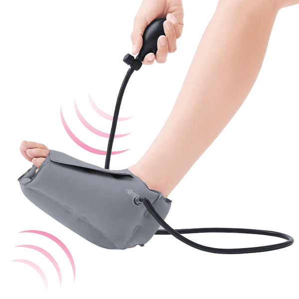 - 足に装着し、手動エアーポンプをふくらませて足の疲れを癒す
