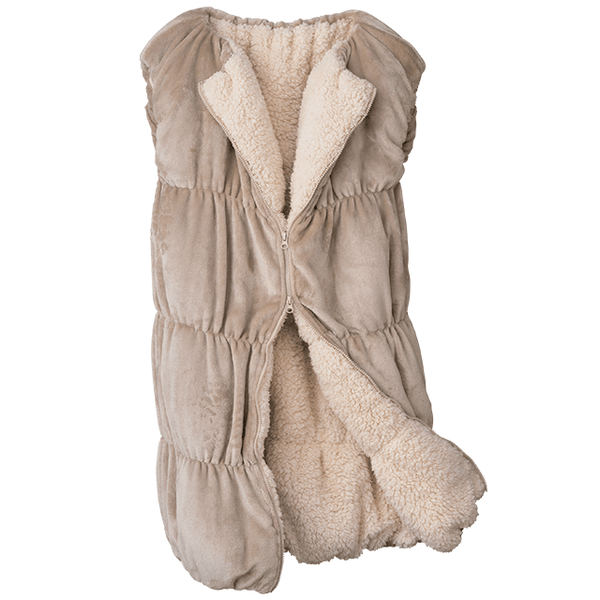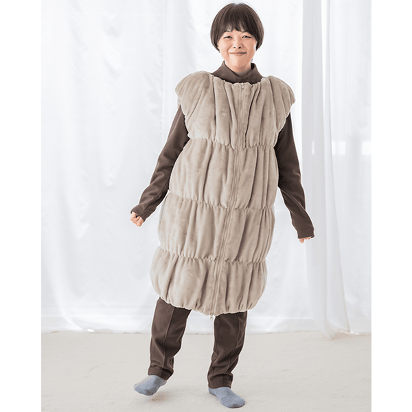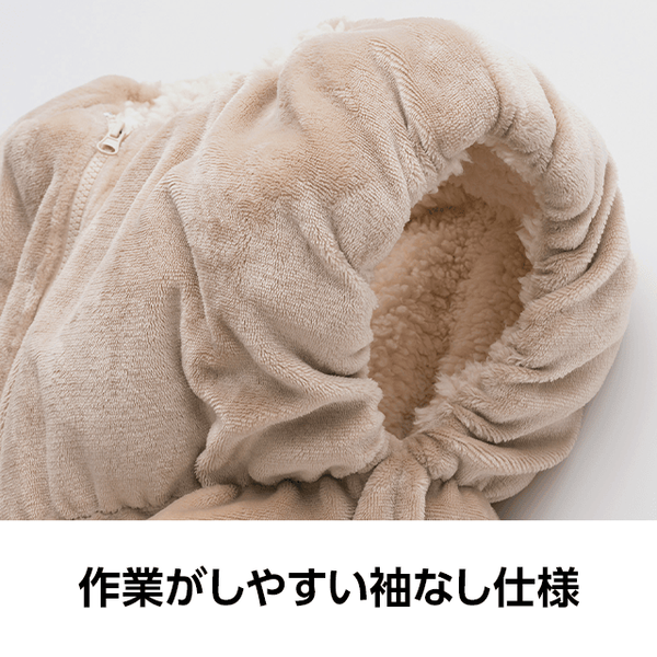 冬の切実な願い…「布団を着たまま動きたい!」をかなえました!ボアと中わたに発熱機能付きで超ぬくぬく、作業がしやすい袖なしデザインの着るおふとん。