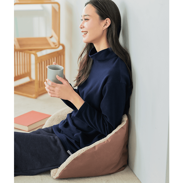 厚み約10cmのたっぷり中わたとボアが冷えやすい腰まわりをすっぽりおおってあたたかい、快適な座り心地のボアクッション。イスや座イス、こたつや車の助手席で横・後ろからの冷気をシャットアウトしてくれます。