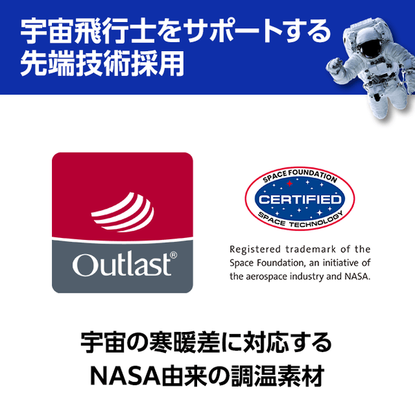 宇宙空間は、極端な高温と低温が隣り合う世界。その過酷な温度差から宇宙飛行士を守るために生まれた調温素材が“アウトラスト®”です。