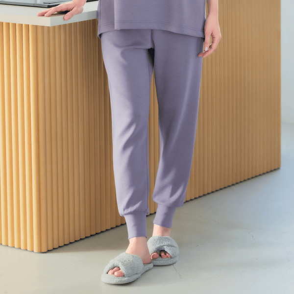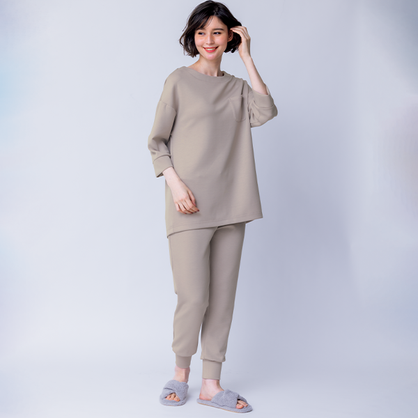 - やわらかくふんわりとした生地で、肌触りがとてもなめらかで心地よさを感じました。裾がすぼまったデザインなので、丈を調整すると7分丈のようにも着られ、動きやすく軽快に過ごせます。シルエットはリラックス感がありながら程よくフィットし、部屋でのリラックスタイムにとてもよさそうです。季節を問わず着回せる便利なアイテムだと思います。