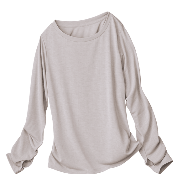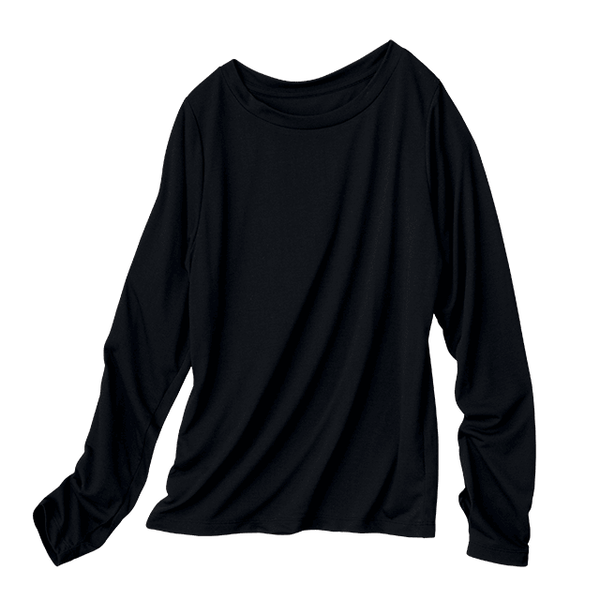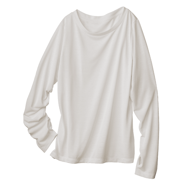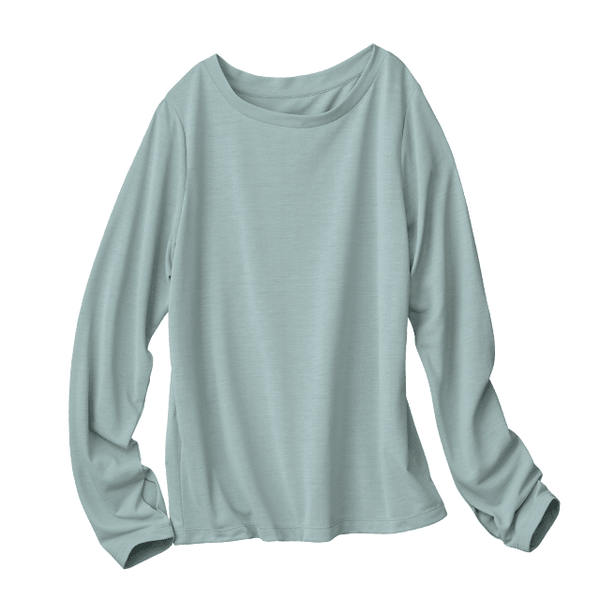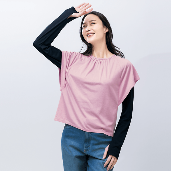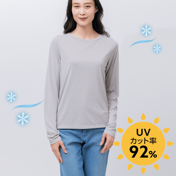 洋服の下に着るだけでUVカットしながら、さらさら&ひんやりをキープします。日焼けや汗のベタつきが気になる時季にぴったりな、薄くて通気性のいい丸首長袖インナーです。