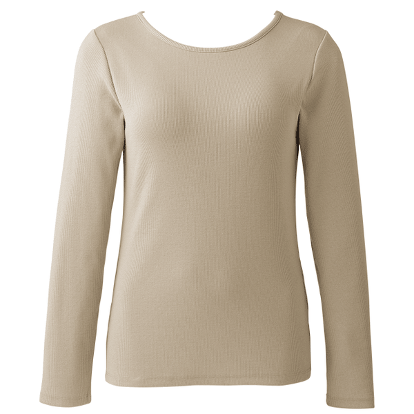 綿混でほどよい厚みのリブ素材で、1枚で着てもサマになります。 Mサイズでぴったりのサイズ感です。締め付け感やアンダーのごろつきがなく、肩も凝らない快適な着用感でバストがきれいに見えます。1枚ではもちろん寒い季節のインナーにもぴったりです。