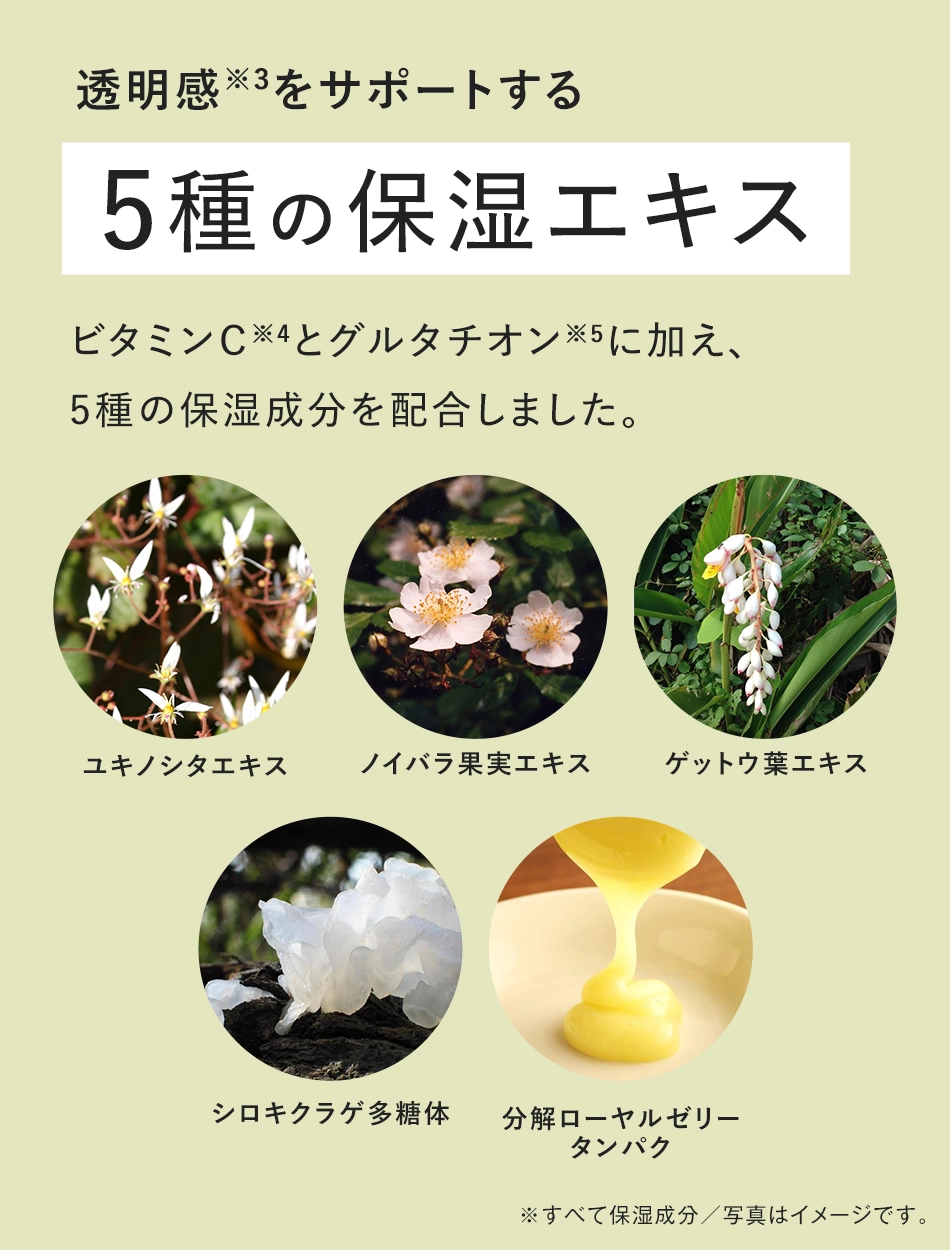 - ※1 ユキノシタエキス・ノイバラ果実エキス・ゲットウ葉エキス・シロキクラゲ多糖体・加水分解ローヤルゼリータンパク/保湿成分