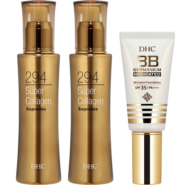 画期的成分「DHCスーパーコラーゲン」を最高濃度※1294倍※2配合した人気のDHCスーパーコラーゲン スプリームと、薬用美白有効成分を新配合したDHC薬用BBクリーム GEのセットです。