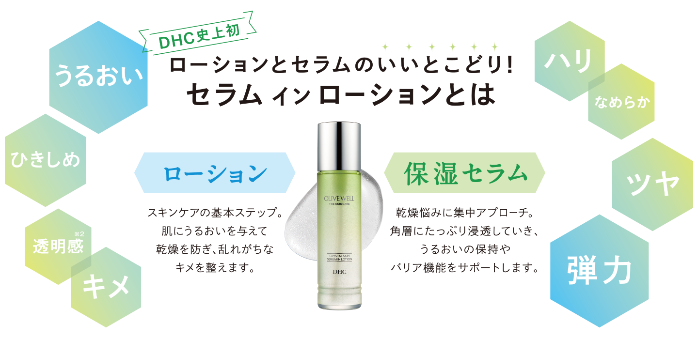 『DHCクリスタルスキン 美容液 ローション』は、独自成分のオリーブ発酵液※1とこだわりの製法で集められた希少なオリーブオイル、フロール・デ・アセイテ※3を融合したセラム(美容液)インローションです。オリーブ由来の保湿成分であるオリーブ葉エキスも加え、オリーブのチカラをとことん引き出しました。