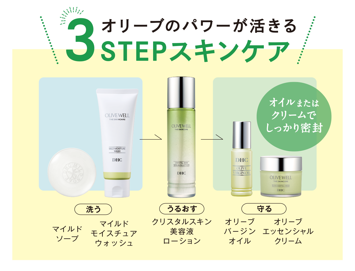 DHCのロングセラー「オリーブすべすべシリーズ」が、長年ご支持いただいているよいところはそのままに、オリーブの新たな力を取り入れた『オリーブウェルシリーズ』へとパワーアップ!「オリーブのチカラ」を通じて「肌を良い状態(=well)に導く」という想いを込めたシリーズ名です。