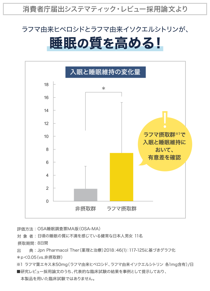 ラフマ由来ヒペロシド、ラフマ由来イソクエルシトリンには、睡眠の質(眠りの深さ・起床時の睡眠に対する満足感)を高める機能が報告されています。