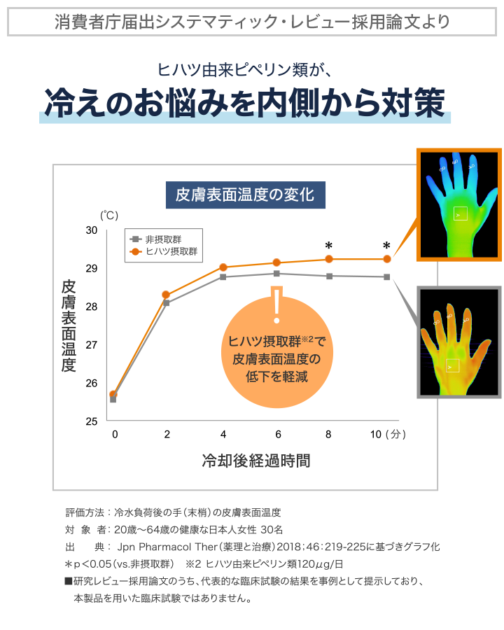 ヒハツ由来ピペリン類には、冷えにより低下した末梢血流を正常に整え、冷えによる末梢(手)の体温(皮膚表面温度)の低下を軽減する機能が報告されています。