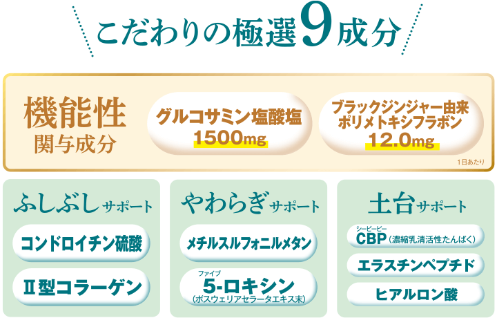さらに、メチルスルフォニルメタン、コンドロイチン硫酸、5-ロキシン、II型コラーゲン、ヒアルロン酸、CBP、エラスチンペプチドと極選した成分をまとめて配合しました。
