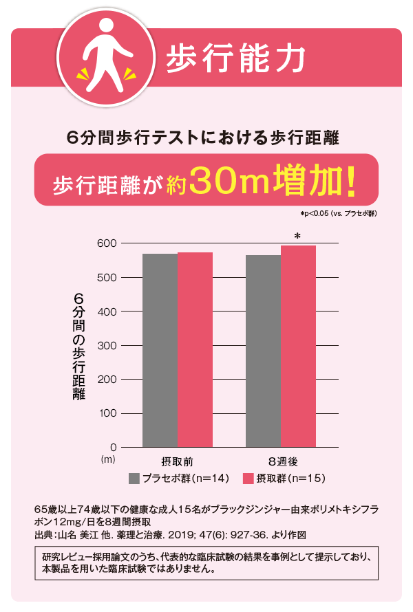 本品に含まれる成分と筋肉に軽い負荷がかかる運動と併用することにより、スムーズな動きと年齢に負けない力強い歩みをトータルサポートします。