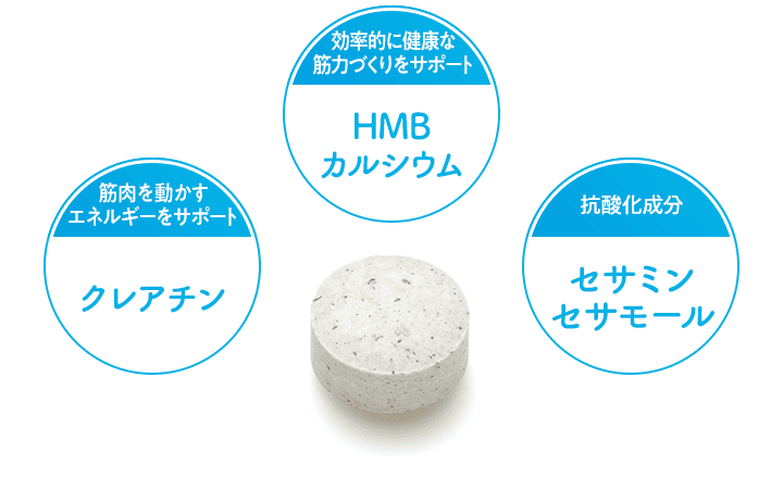 効率的に健康な筋力づくりをサポートするHMBカルシウム、筋肉を動かすエネルギーをサポートするクレアチンを配合。