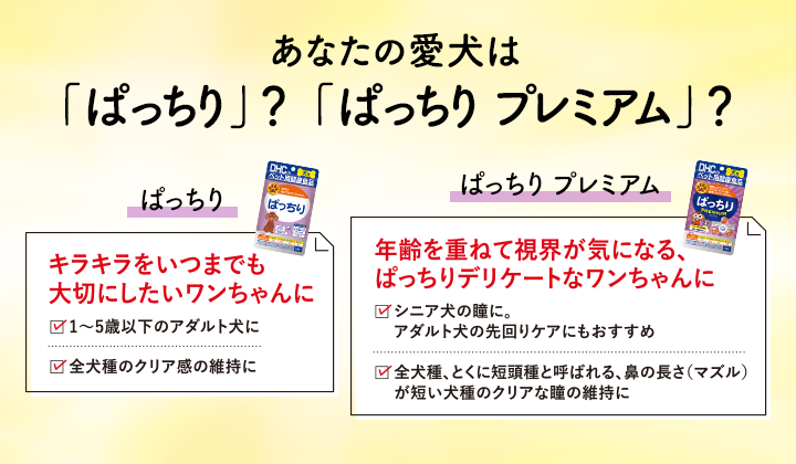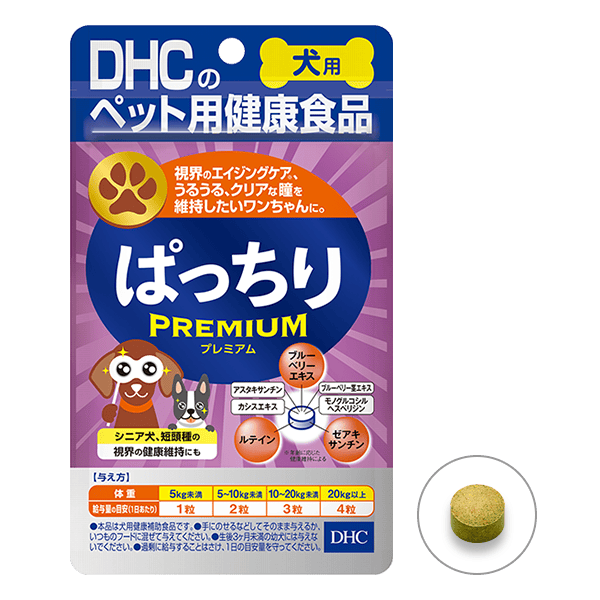 『犬用 国産 ぱっちり プレミアム』は、大人気の愛犬の瞳ケアサプリメント『犬用 国産 ぱっちり』に新成分をプラスして、プレミアムな処方となって新登場しました。