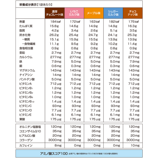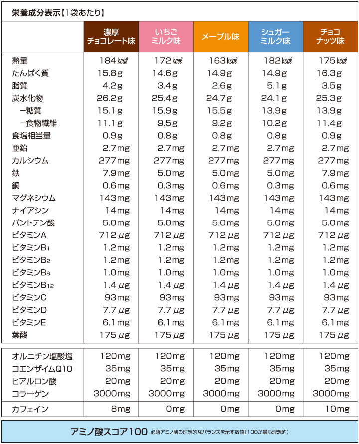 ◆シュガーミルク味◆コーンフレーク(国内製造)、難消化性デキストリン、大豆パフ、クリーミングパウダー、大豆蛋白、コラーゲンペプチド、ブランフレーク、乳等を主要原料とする食品、乾燥いちご加工品、ドロマイト、粉糖、酵母エキス調味料、食塩、オルニチン塩酸塩、コエンザイムQ10、パン酵母/香料、増粘剤(キサンタンガム)、リジン塩酸塩、メチオニン、V.C、甘味料(ステビア、スクラロース、ラカンカ)、トリプトファン、ロイシン、クエン酸鉄Na、ヒアルロン酸、酸味料、スレオニン、V.E、酸化防止剤(V.E、ローズマリー抽出物)、ナイアシン、パントテン酸Ca、V.B1、鉄、V.B6、V.B2、V.A、葉酸、V.D、V.B12、(一部に小麦・乳成分・大豆・豚肉を含む)