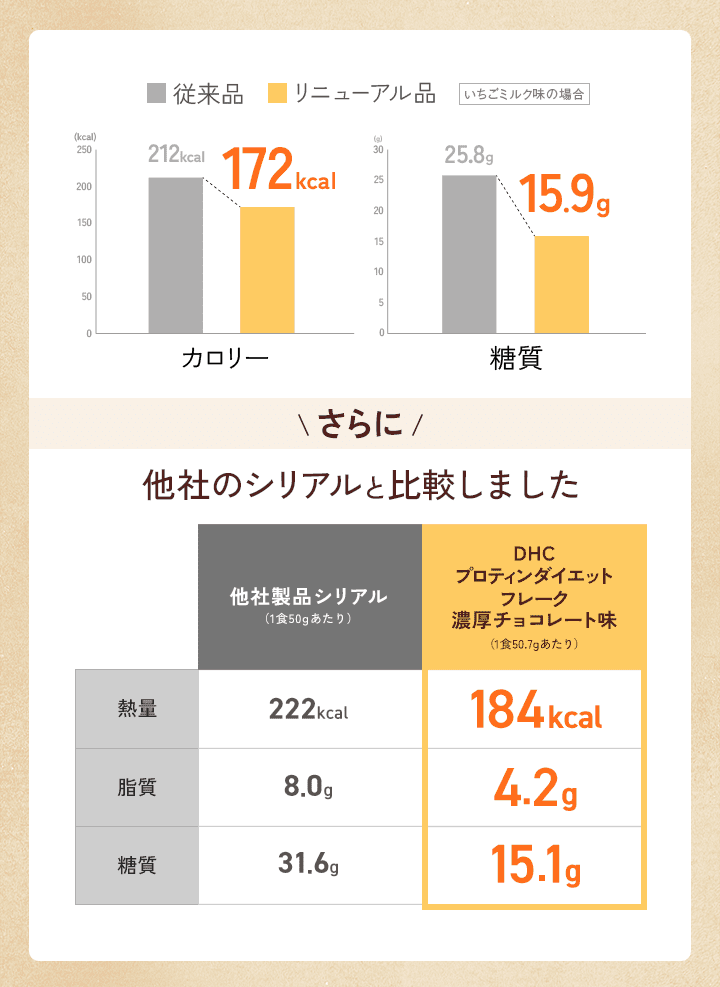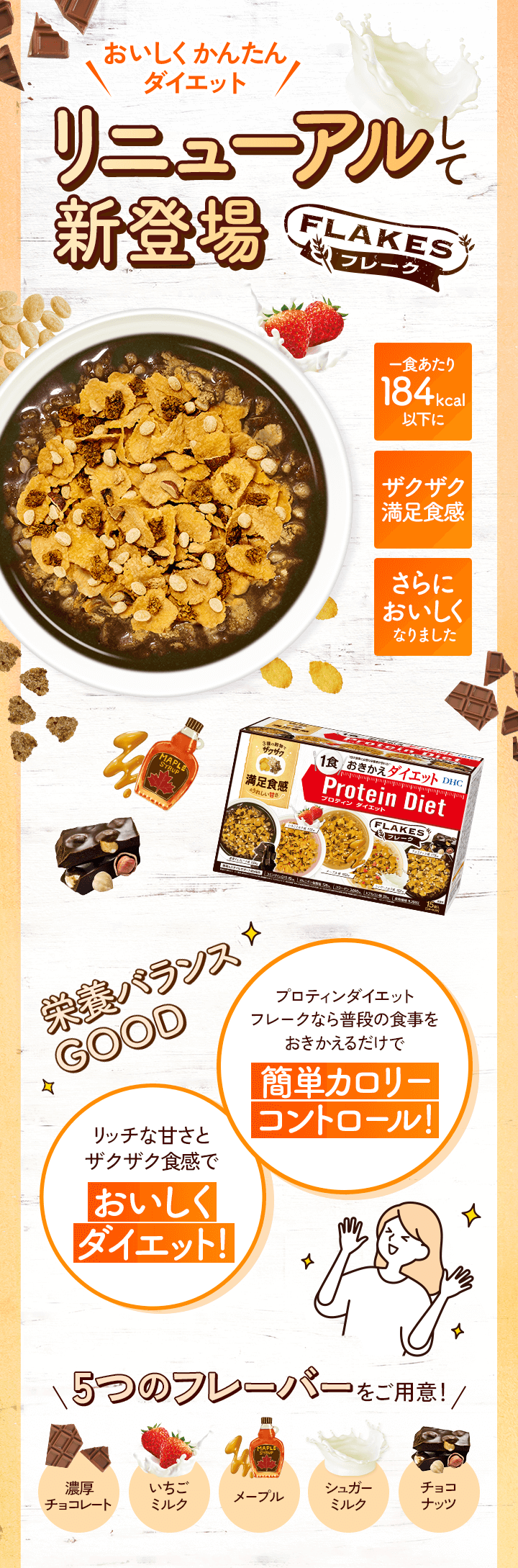 1食184kcal以下のフレークタイプおきかえ食。ザクザク食感でダイエット中でもしっかり満足!