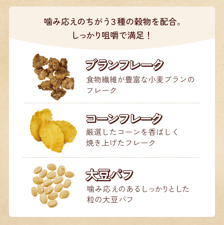 硬さや大きさなどが異なる3種の穀物とナッツやドライフルーツなども配合。ザクザクとした噛み応えを最後まで楽しめます。しっかり噛むことで満腹中枢を刺激し、より満足感を実感できます。