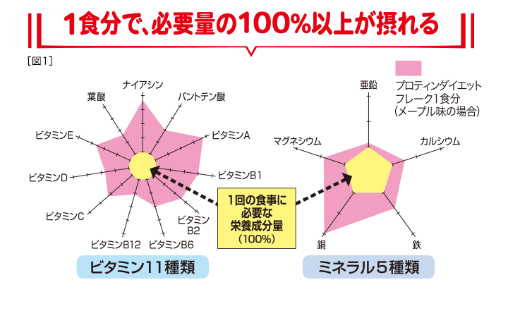 1回の食事に必要な※1ビタミン11種類、ミネラル5種類に加えて、たんぱく質、食物繊維も充実配合! カロリー制限時に不足しやすい栄養素をきちんと摂取でき、健康的なダイエットをサポートします。