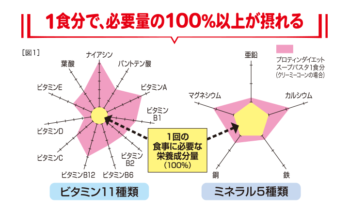 - *「1食あたり」とは、[クリーミーオニオン]粉末スープ33g、パスタ・具材19.7g/[完熟トマト]粉末スープ37g、パスタ・具材19.9g袋/[クリーミーコーン]粉末スープ33g、パスタ・具材20.4g/[ミネストローネ]粉末スープ37g、パスタ・具材20.4g/[クラムチャウダー]粉末スープ33g、パスタ・具材19.5gを指します。