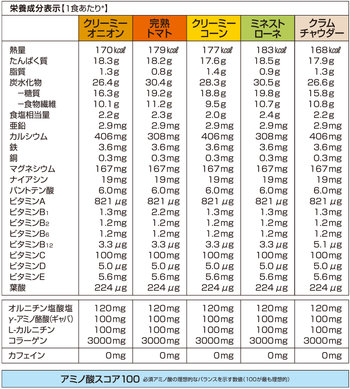◆クラムチャウダー:[粉末スープ]イヌリン、乳蛋白、乳蛋白濃縮物、コラーゲンペプチド、大豆蛋白、食塩、ドロマイト、蛋白質濃縮ホエイパウダー、チキンブイヨンパウダー、ブドウ糖、粉末油脂、アサリエキスパウダー、脱脂粉乳、オニオンパウダー、酵母エキスパウダー、L-カルニチン酒石酸塩、オルニチン塩酸塩、ホタテエキスパウダー、乾燥マッシュポテトパウダー、ギャバ、香辛料、チーズ加工品、野菜エキスパウダー、乾燥パセリ、水あめ、パン酵母/調味料(アミノ酸等)、増粘剤(キサンタンガム)、加工デンプン、塩化K、V.C、クエン酸鉄Na、カゼインNa、V.E、ナイアシン、乳化剤、パントテン酸Ca、V.B1、V.B6、V.B2、V.A、香料、葉酸、酸化防止剤(トコフェロール)、V.D、V.B12、(一部に小麦・乳成分・大豆・鶏肉・豚肉を含む)[パスタ・具材]インスタントパスタ(国内製造)、乾燥アサリ、乾燥たまねぎ/トレハロース、調味料(アミノ酸)、酸化防止剤(V.E)、(一部に小麦を含む)