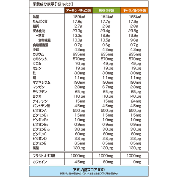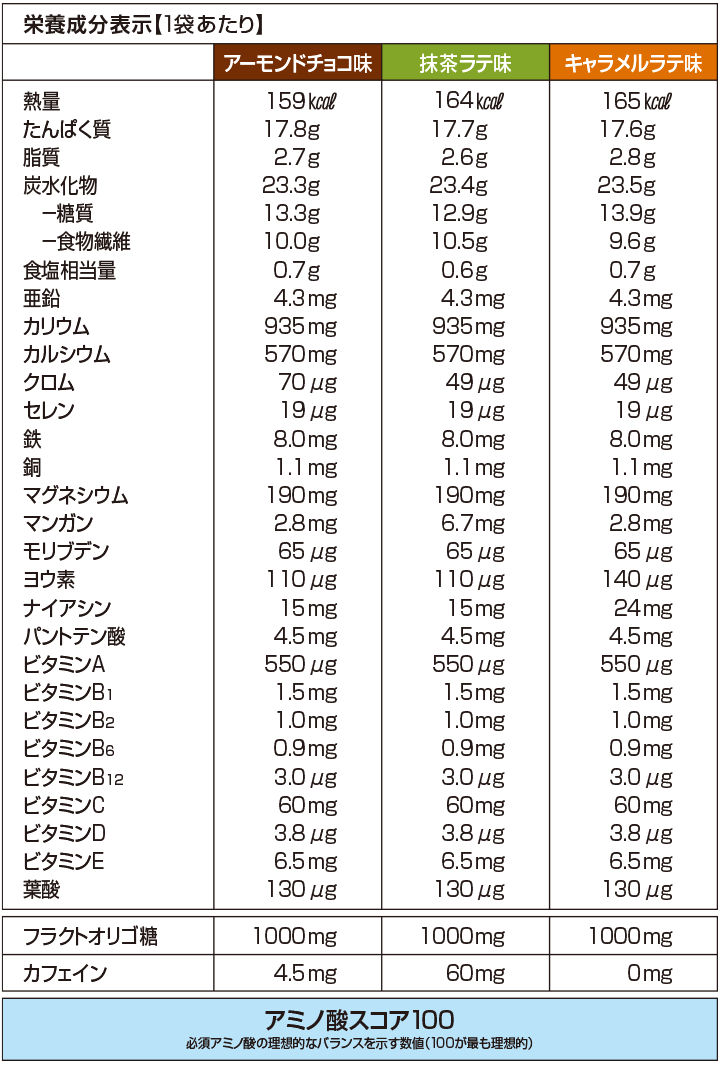 ◆キャラメルラテ味:大豆蛋白(国内製造)、イヌリン、アーモンド蛋白、キャラメルパウダー、カラメルシラップパウダー(カラメルシラップ、デキストリン)、デキストリン、粉末油脂(乳成分を含む)、果糖、エリスリトール、フラクトオリゴ糖、ドロマイト、乳等を主要原料とする食品、パン酵母、さとうきび抽出物粉末、乳酸菌・ビフィズス菌混合末(殺菌)(乳酸菌18種類、ビフィズス菌5種類)、乳酸菌末(殺菌)/クエン酸K、カラメル色素、酸味料、貝Ca、塩化K、香料、乳化剤、V.C、シスチン、甘味料(ステビア、スクラロース)、ピロリン酸鉄、増粘剤(キサンタンガム)、ナイアシン、V.E、パントテン酸Ca、調味料(アミノ酸等)、V.B1、V.B2、V.B6、V.A、葉酸、V.D、V.B12