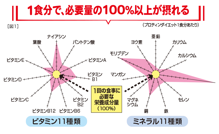 1回の食事に必要な※2ビタミン11種類、ミネラル11種類に加えて、たんぱく質、食物繊維も充実配合! カロリー制限時に不足しやすい栄養素をきちんと摂取でき、健康的なダイエットをサポートします。