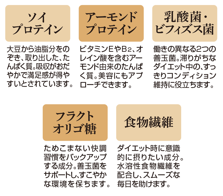 吸収スピードが穏やかで腹持ちが良いとされる「ソイプロテイン」と、ビタミンEやB2、オレイン酸を含むとされる「アーモンドプロテイン」をW配合。さらに24種類の善玉菌(乳酸菌、ビフィズス菌)と、その働きを助けるオリゴ糖や食物繊維といった腸活成分ですっきりもサポートします。
