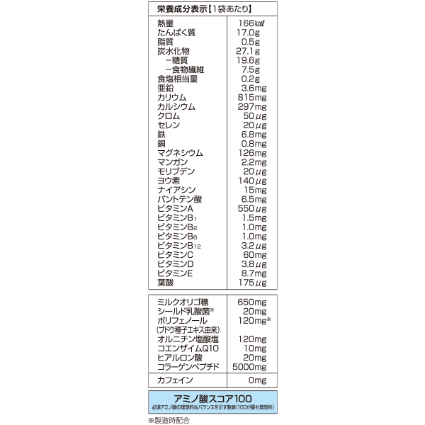 乳清蛋白(アメリカ製造)、イヌリン、デキ カロリーコントロールストリン、コラーゲンペプチド(豚肉を含む)、果糖、エリスリトール、乳等を主要原料とする食品、ドロマイト、ラクチュロース、パン酵母、さとうきび抽出物粉末、オルニチン塩酸塩、ブドウ種子エキス末、乳酸菌末(殺菌)、コエンザイムQ10、乳酸菌・ビフィズス菌混合末(殺菌)(乳酸菌18種類、ビフィズス菌5種類)/酸味料、クエン酸K、塩化K、乳化剤(大豆由来)、甘味料(アスパルテーム・L-フェニルアラニン化合物、スクラロース、アセスルファムK)、香料、ヒスチジン、V.C、ピロリン酸鉄、ヒアルロン酸、ナイアシン、V.E、調味料(アミノ酸等)、パントテン酸Ca、V.B1、V.B2、V.B6、V.A、葉酸、V.D、V.B12